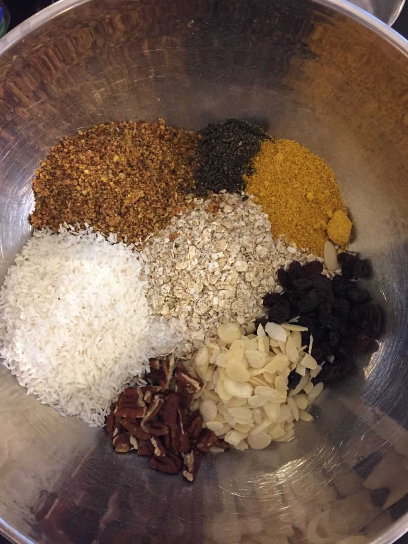 Put all the dry ingredients in a big bowl and mix them. Put the wet ingredients in a saucepan and heat until they all melt and mix together. Pour the wet onto the dry ingredients and mix really well. Put them on a lined baking sheet in the oven at 160 for 10 minutes. Remove and stir them. Put them back in the oven for another 10 minutes then remove, stir and leave to cool.