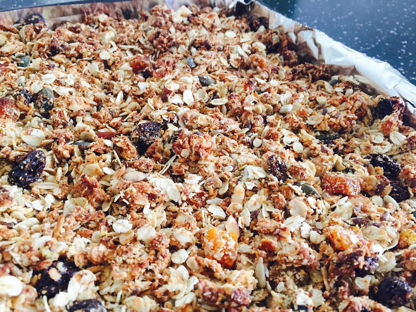 Pour the wet onto the dry ingredients and mix really well. Put it all on a lined baking sheet and into the oven at 180 for 10 minutes. Remove and turn it all over with a fork so other parts get a chance to get brown. Put it back in the oven for another 10 minutes then remove, stir and leave to cool. Pop your amazing cereal in an airtight container ready to use in the morning.