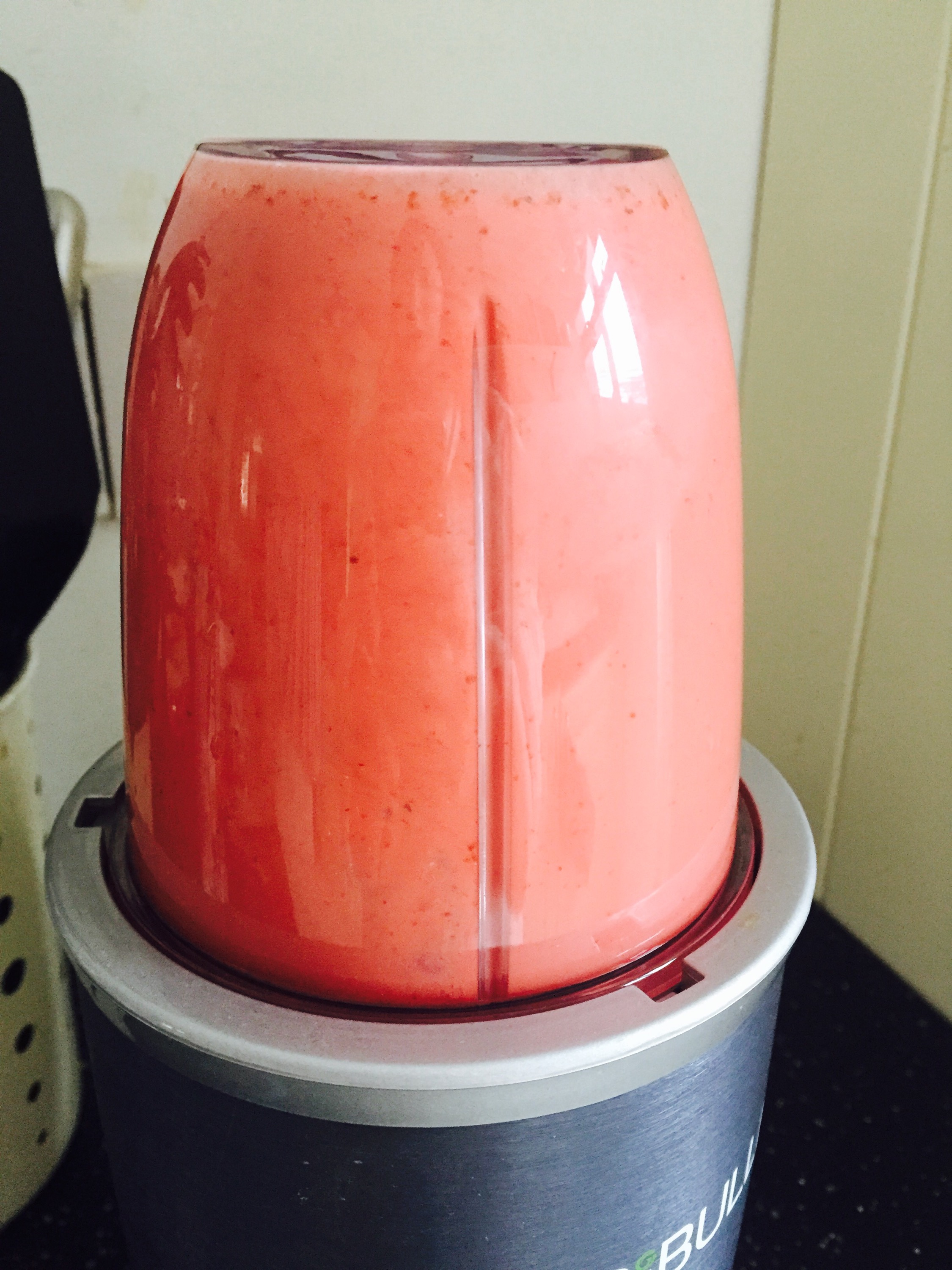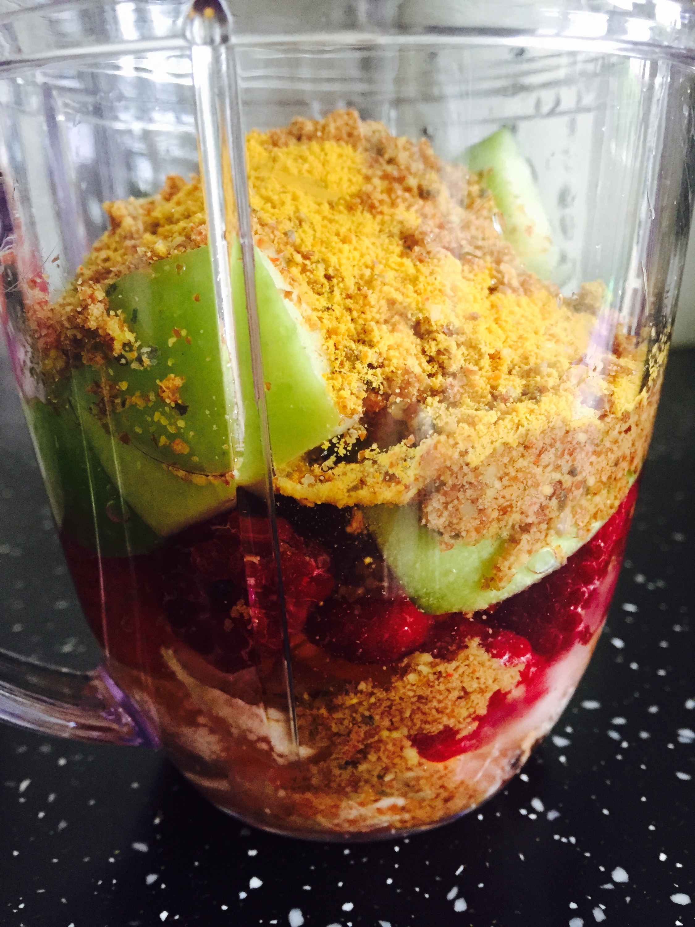 simple smoothie ingredientsIn my smoothie I’ve added one satsuma, one Granny Smith, two strawberries, a handful of frozen raspberries, bee pollen, milled flax seed and water. Blitz away